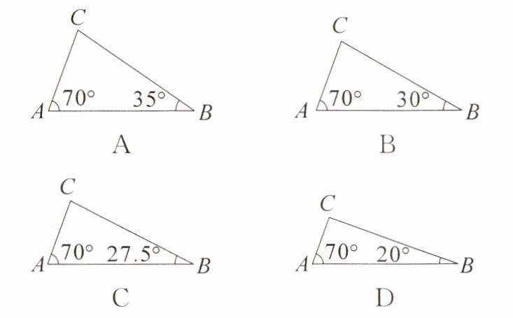 10. 新考向 动手操作 有四张形状不同的三角形纸片$ABC$,用剪刀沿经过顶点$C$的一条直线将它们分别剪开(只允许剪一次),不能得到两个等腰三角形纸片的是 (