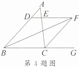 4. 如图,$\angle ABC$ 的平分线 $BF$ 与 $\triangle ABC$ 的外角 $\angle ACG$ 的平分线相交于点 $F$,过点 $F$ 作 $DF // BC$ 交 $AB$ 于点 $D$,交 $AC$ 于点 $E$。若 $BD = 8$,$CE = 6$,则 $DE$ 的长为
