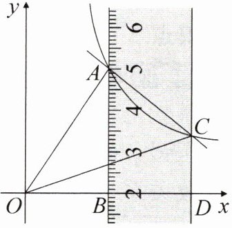 3. 【问题情境】如图,平行于 $ y $ 轴的直尺(一部分)与反比例函数 $ y = \frac{k}{x} $($ x > 0 $)的图象交于点 $ A $ 和点 $ C $,与 $ x $ 轴交于点 $ B $ 和点 $ D $,点 $ A $,$ B $ 的刻度分别为 $ 5 \, cm $ 和 $ 2 \, cm $,直尺的宽度为 $ 2 \, cm $,$ OB = 2 \, cm $,经过 $ A $,$ C $ 两点的直线的表达式为 $ y = mx + b $。(平面直角坐标系中一个单位长度为 $ 1 \, cm $)