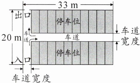 6. 新考向 情境题·停车场 如图是某停车场的平面示意图,停车场外围的长为 $ 33 $ m,宽为 $ 20 $ m,停车场内车道的宽度都相等。若停车位的总占地面积为 $ 510 $ m^2,求车道的宽度。