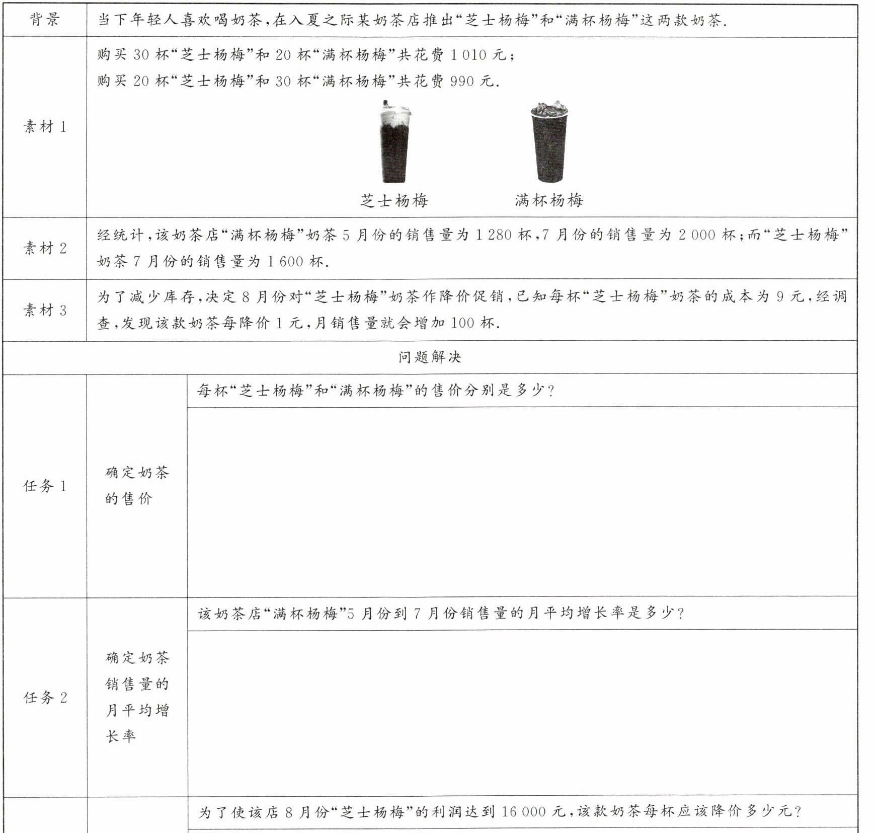 任务1:每杯“芝士杨梅”的售价是21元,每杯“满杯杨梅”的售价是19元.任务2:25%.任务3:4元.