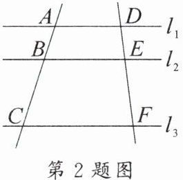 2. [2025·长沙期末]如图,直线$ l_1//l_2//l_3,$直线 AC 和 DF 被$ l_1,l_2,l_3 $所截,AB= 2,BC= 4,EF= 6,则 DE 的长为(