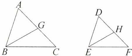 5. 如图,已知$\triangle ABC\backsim\triangle DEF$,$BG$,$EH分别是\triangle ABC和\triangle DEF$的角平分线,$BC = 6\mathrm{cm}$,$EF = 4\mathrm{cm}$,$BG = 4.8\mathrm{cm}$。求$EH$的长。