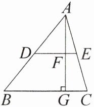 2. 如图,已知$\triangle ADE\backsim\triangle ABC$,$AG\perp BC于点G$,交$DE于点F$,且$AF:AG = 1:2$,则$\triangle ADE与\triangle ABC$的相似比等于