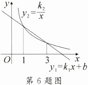 6. [数形结合]一次函数$y_1 = k_1x + b与反比例函数y_2= \frac{k_2}{x}(x\gt0)$的图象如图所示,当$y_1\gt y_2$时,自变量$x$的取值范围为