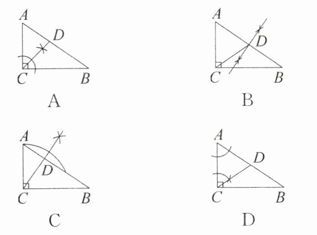 8. 新考向 尺规作图 在$\mathrm{Rt}\triangle ABC$中,$\angle ACB = 90^{\circ}$,用直尺和圆规在$AB上确定点D$,使$\triangle ACD \sim \triangle CBD$,根据作图痕迹判断,正确的是(