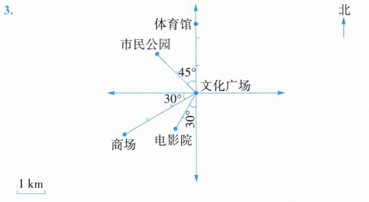 (3)电影院在文化广场南偏西 $30^{\circ}$ 方向 $1.5$ km 处。