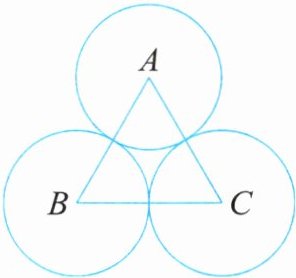 3 如图,$△ABC$是以三个完全相同的圆的圆心为顶点的三角形。已知每个圆的直径都是10cm,那么$△ABC$的周长是多少厘米?$△ABC$的每个角是多少度?