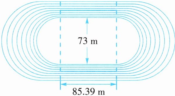3 国际标准田径跑道中间直跑道长 $85.39$ m,两端的弯道呈半圆形,直径是 $73$ m,跑道宽 $1.22$ m。第 $6$ 道起跑线应在第 $1$ 道起跑线前多少米?