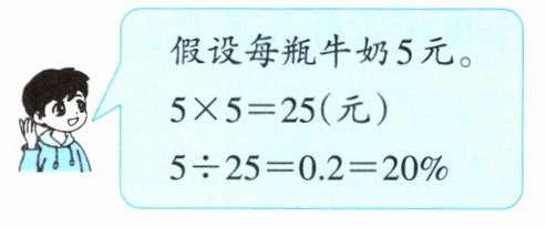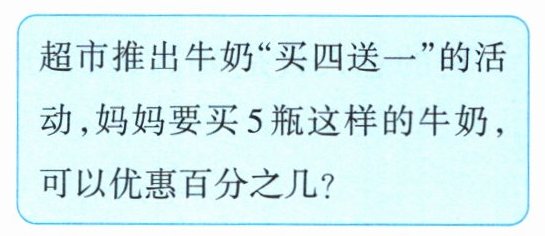 不同方法:买四送一即付4瓶的钱得5瓶,优惠1瓶的钱。优惠金额占原价比例为$1÷5 = 0.2 = 20\%$。