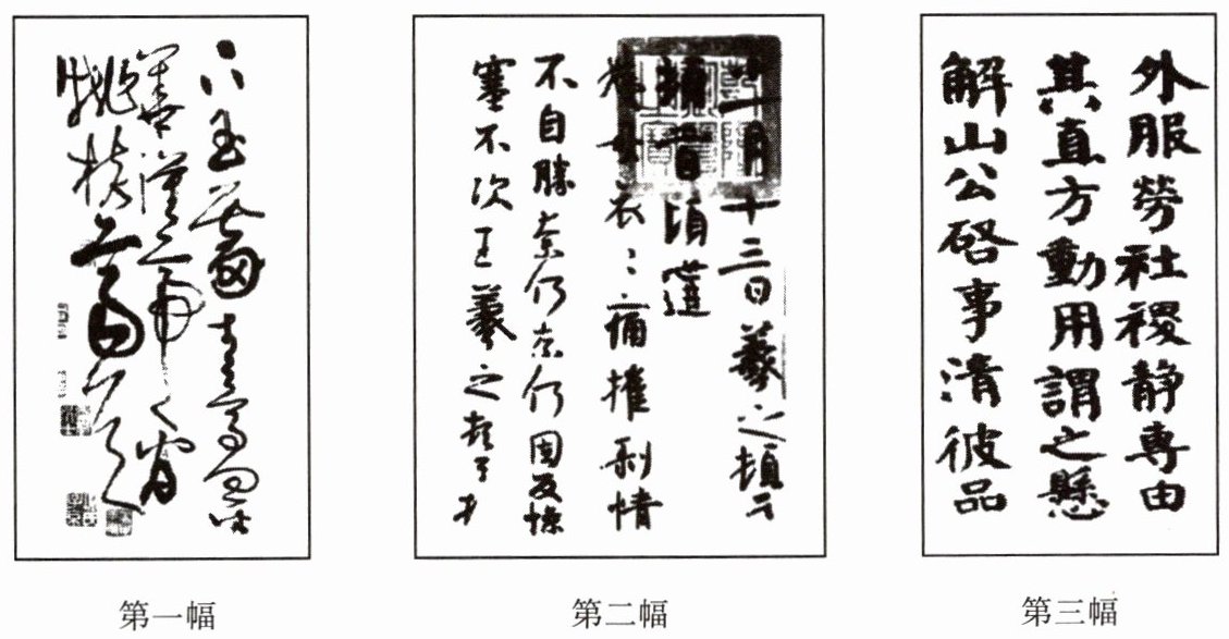 (1)汉字书法是汉民族独创的,以“文房四宝”为工具,能反映书法家学识人品,是富有美感的艺术。 (2)三 颜真卿的书法有“庄严正直之美”,具有楷书的特点,而第三幅书法作品点画精到,顿挫有力,字体规正,体现出了楷书的端正之美。