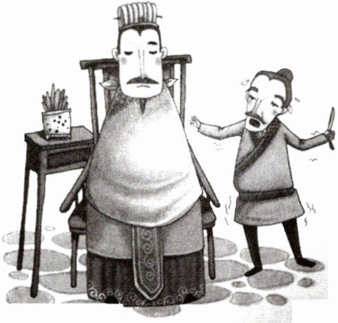 二、问题引导观察方向。坐在凳子上的那个人的脸是什么形状?五官长得怎样?缺不缺什么?旁边那个人手里拿着什么?一个人缺了眉毛,另一个人手里拿着一把刀说明了什么?