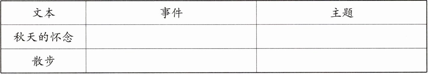 《秋天的怀念》事件:母亲在“我”瘫痪后提议看菊花并临终牵挂子女;主题:母爱、怀念与愧疚。《散步》事件:一家四口散步时解决路线分歧共同前行;主题:家庭亲情、尊老爱幼。