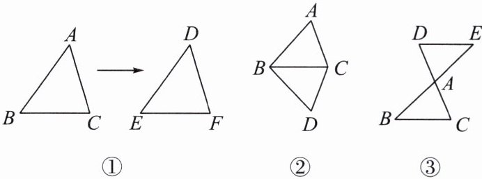 对应角:$\angle A$对$\angle D$,$\angle B$对$\angle E$,$\angle C$对$\angle F$;