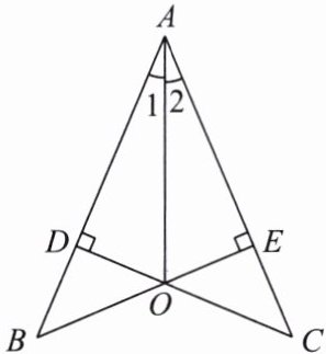 例2 如图,$ CD \perp AB $,$ BE \perp AC $,垂足分别为 $ D $,$ E $,$ BE $,$ CD $ 相交于点 $ O $,连接 $ AO $,$ OB = OC $. 求证: