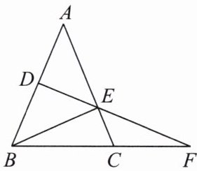 例2 如图,在$\triangle ABC$中,$D是AB$的中点,$F是BC$的延长线上一点,连接$DF交AC于点E$,连接$BE$,$\angle A = \angle ABE$.