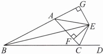 由于 $BE$ 是角 $\angle ABC$ 的平分线,且 $EG \perp BA$,$EH \perp BD$,根据角平分线的性质,得到 $EG = EH$。