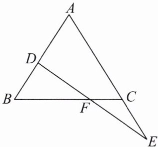 例 3 如图,点$E在\triangle ABC的边AC$的延长线上,点$D在边AB$上,$DE交BC于点F$,$DF = EF$,$BD = CE$.求证:$\triangle ABC$是等腰三角形.
