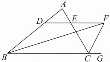 例 2 如图,在$\triangle ABC$中,$\angle ABC的平分线BF与外角\angle ACG的平分线相交于点F$,过点$F作DF// BC交AB于点D$,交$AC于点E$.若$BD = 8\mathrm{cm}$,$DE = 2.5\mathrm{cm}$,则$CE$的长为( )
