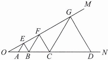 例1 如图,∠MON = 30°,点A,B,C,D在射线ON上,点E,F,G在射线OM上,△ABE,△BCF,△CDG均为等边三角形,若OA = 1,则△CDG的周长为______.