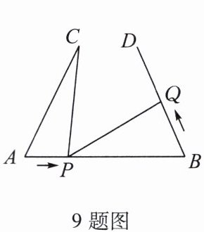 9. 如图,$ AB = 4cm $,$ AC = BD = 3cm $. $ \angle CAB = \angle DBA $,点 $ P $ 在线段 $ AB $ 上以 $ 1cm/s $ 的速度由点 $ A $ 向点 $ B $ 运动,同时,点 $ Q $ 在线段 $ BD $ 上由点 $ B $ 向点 $ D $ 运动. 设运动时间为 $ t s $,则当点 $ Q $ 的运动速度为______ $ cm/s $ 时,$ \triangle ACP $ 与 $ \triangle BPQ $ 有可能全等.