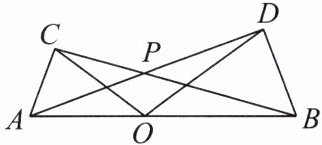 13. 如图,$ O $ 为 $ AB $ 上的任意一点(不与点 $ A $,$ B $ 重合),分别以 $ AO $,$ BO $ 为一腰在 $ AB $ 的同侧作等腰三角形 $ AOC $ 和等腰三角形 $ BOD $,$ OA = OC $,$ OB = OD $,$ \angle AOC $ 与 $ \angle BOD $ 都是锐角,且 $ \angle AOC = \angle BOD $,$ AD $ 与 $ BC $ 相交于点 $ P $,$ \angle COD = 110^{\circ} $,则 $ \angle APB $ 的度数为 。