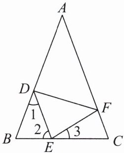 12. 如图,在 $ \triangle ABC $ 中,$ AB = AC $,点 $ D $,$ E $,$ F $ 分别在边 $ AB $,$ BC $,$ AC $ 上,且 $ BE = CF $,$ BD = CE $。当 $ \angle A = 40^{\circ} $ 时,$ \angle DEF $ 的度数为 。