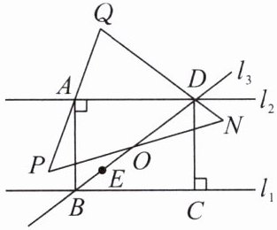 12.如图,直线$l_1// l_2$,直线$l_3交直线l_1于点B$,交直线$l_2于点D$,$O是线段BD$的中点.过点$B作BA\perp l_2于点A$,过点$D作DC\perp l_1于点C$,$E是线段BD$上一动点(不与点$B,D$重合),点$E关于直线AB,AD的对称点分别为P,Q$,射线$PO与射线QD相交于点N$,连接$PQ$.