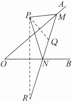 9.如图,$P是\angle AOB$外一点,$M,N分别是\angle AOB$两条边上的点,点$P关于OA的对称点Q恰好落在线段MN$上,点$P关于OB的对称点R落在线段MN$的延长线上.若$PM= 2.5\ cm$,$PN= 3\ cm$,$MN= 4\ cm$,则线段$QR$的长为 .