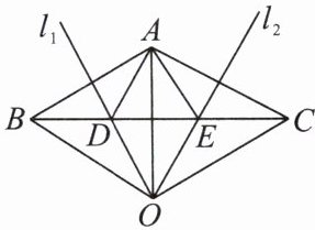 12. 如图,在△ABC 中,AB 的垂直平分线$ l_1$交 BC 于点 D,AC 的垂直平分线$ l_2$交 BC 于点$ E,l_1$与$ l_2$相交于点 O,连接 AD,AE,OA,OB,OC. △ADE 的周长为 8 cm,△OBC 的周长为 20 cm.