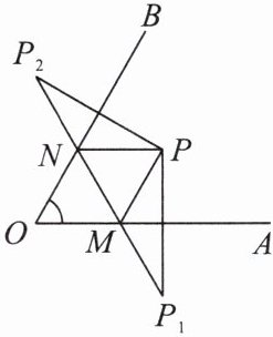 10. 如图,P 为∠AOB 内一点,分别作出点 P 关于 OA,OB 的对称点$ P_1,P_2,$连接$ P_1P_2$交 OA 于点 M,交 OB 于点 N. 若$ P_1P_2 = 6,$则△PMN 的周长为_________。