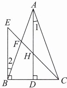 12. 如图,在$\triangle ABC$中,$AD\perp BC于点D$,$F为AB$上一点,连接$CF交AD于点H$,过点$B作BE\perp BC交CF的延长线于点E$,且$\angle 1 = \angle 2$。