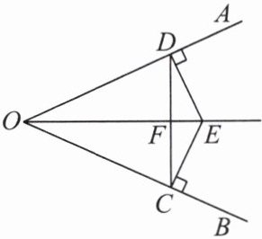 13. 如图,$ E $ 是 $ \angle AOB $ 的平分线上一点,$ EC \perp OB $,$ ED \perp OA $,垂足分别是 $ C $,$ D $,连接 $ CD $,交 $ OE $ 于点 $ F $。