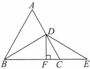 11. 如图,$ \triangle ABC $ 是等边三角形,$ BD $ 是中线,延长 $ BC $ 至点 $ E $,使 $ CE = CD $,$ DF \perp BE $,垂足为 $ F $。