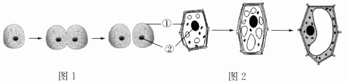 (1) 图 1 表示的是动物细胞的______过程。图 2 表示的是植物细胞的______过程,细胞体积增大的同时,细胞质里多个______(填结构名称)也逐渐胀大合并。