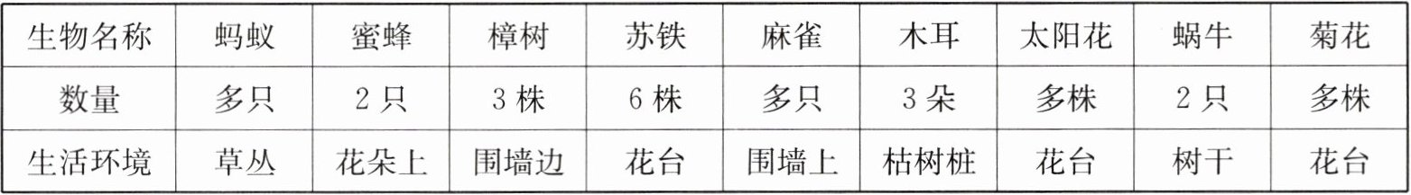 9. 下表是某生物学兴趣小组填写的生物种类观察记录表,请分析并回答问题: