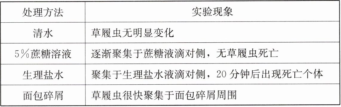 6. 在观察草履虫时,同学们分别向草履虫培养液的一侧滴加了不同物质,实验处理方法与实验现象记录于下表中。下列叙述错误的是( )。