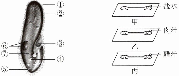 实验方案:①取甲、乙、丙三个载玻片,分别在其两端各滴一滴草履虫培养液,并使其相互连通;②在甲、乙、丙三个载玻片右侧培养液边缘分别滴一小滴盐水、一小滴肉汁、一小滴醋汁;③用显微镜观察发生的现象,分析并得出结论。