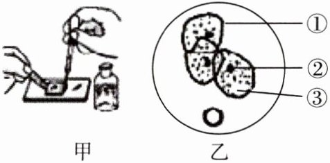 6. 图甲是制作人的口腔上皮细胞临时装片的步骤之一,图乙是在双目显微镜下观察到的人的口腔上皮细胞临时装片的物像。下列说法不正确的是( )。