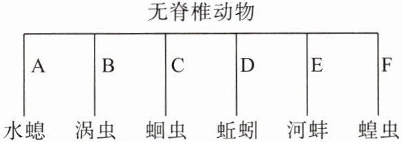 (2)角质层 贝壳 外骨骼 保护 (3)A、B (4)D类动物身体由许多相似的体节构成,C类动物身体不分节 (5)[F] 节肢动物 体表有外骨骼 身体和附肢都分节