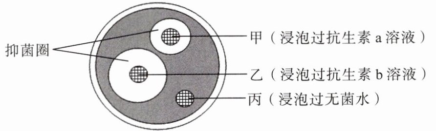 8. 为探究两种抗生素对某细菌的抑制效果,设计如图所示实验方案:在无菌固体培养基表面涂布被检测细菌,放置甲、乙和丙三张圆形滤纸片(抗生素可在培养基中扩散,滤纸片周围出现抑菌圈的大小能反映其抑菌效果)。下列说法错误的是( )。