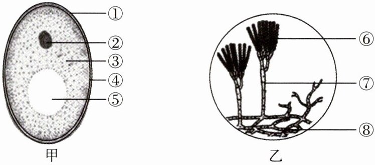 9. 如图是某学生做“观察酵母菌和霉菌”的实验时,绘制的显微镜下观察到的酵母菌(甲)和青霉(乙)形态结构简图。请你根据所做过的实验和观察到的实验现象,回答下列问题: