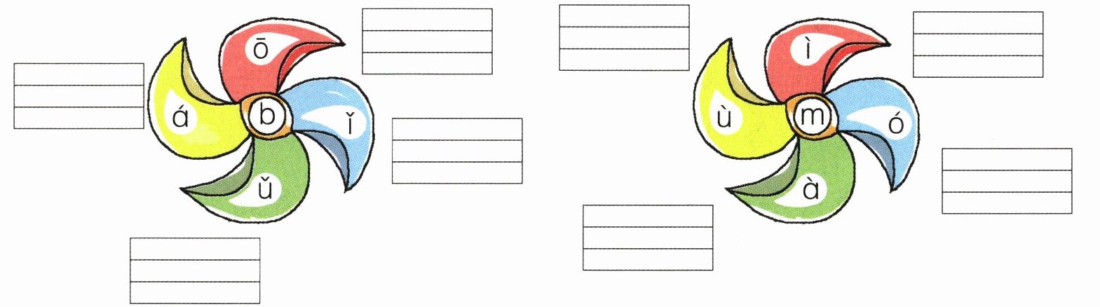 二、按每个大风车"红、蓝、绿、黄"的顺序:bō bǐ bǔ bá mì mó mà mù