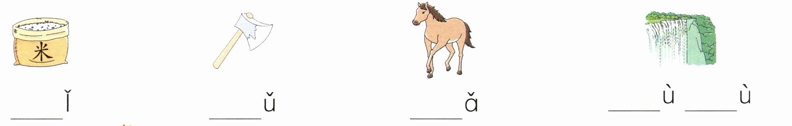 解析:这道题考查借助图片拼写音节的能力。借助给出的图片和韵母把音节补充完整。第一幅图画的是米,第二幅图画的是斧头,第三幅图画的是马,第四幅图画的是瀑布,据此补充音节。