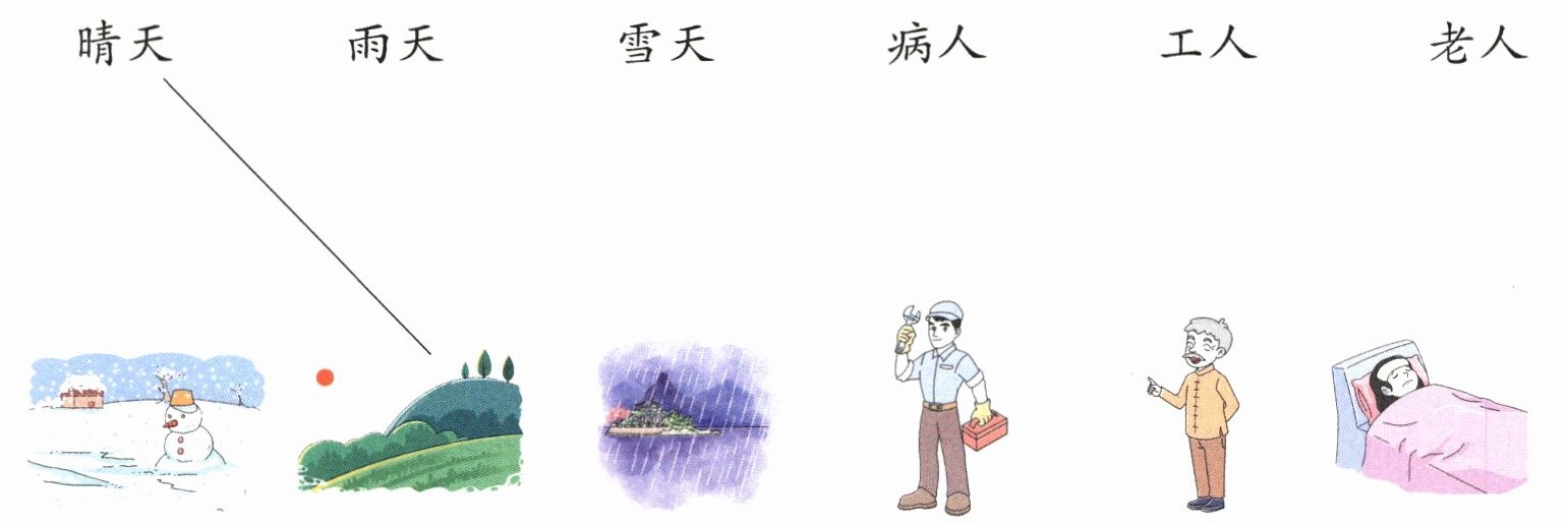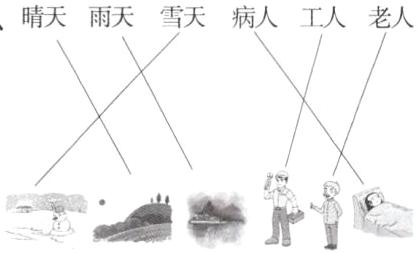解析:这道题考查观察图片的能力。答题时,先仔细听爸爸妈妈读词语,再分析图片中的内容,最后把词语与对应的图片用线连起来。