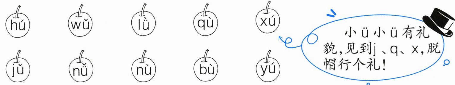 解析:这道题考查对所学拼音的掌握。韵母是“ü”的音节有“lǜ、qù、xú、jǔ、nǚ、yú”,注意“ü”遇到“j、q、x”需要去掉上面的两个点,“y”和“ü”组成音节时,“ü”上面的两点也要去掉。按顺序涂色即可。