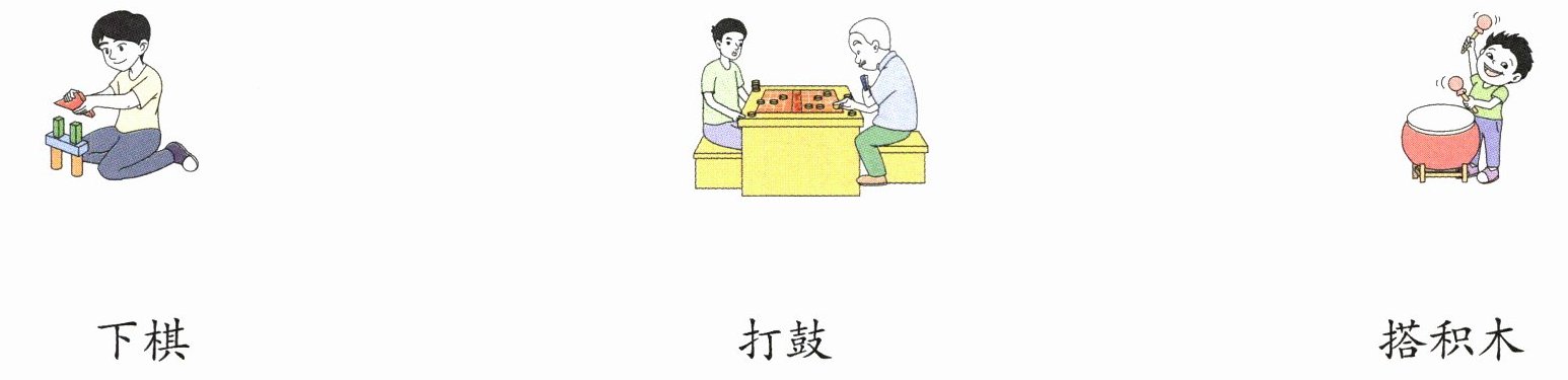 解析:这道题考查借助图片识字的能力。第一幅图是一个小男孩在搭积木,第二幅图是两个人在下棋,第三幅图是一个小男孩在打鼓。据此连线即可。