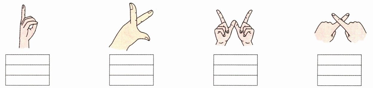 解析:这道题考查借助图片写字母的能力。观察图片并结合所学知识可知,第一幅图中的手势像字母“b”,第二幅图中的手势像字母“k”,第三幅图中的手势像字母“w”,第四幅图中的手势像字母“x”。
