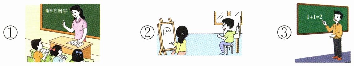 解析:这道题考查提取信息的能力。由课程表可知,阳阳第一节上数学课,第二节上语文课,第三节上美术课。观察图片可知:第一幅图中的黑板上写着古诗句,是语文课;第二幅图中的同学们在画画,是美术课;第三幅图中的黑板上写着算术题,是数学课。据此填序号。