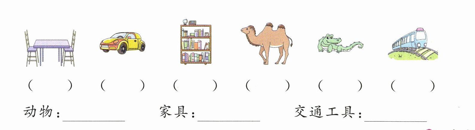 ② ⑤ ④ ① ③ ⑥ 动物:①③ 家具:②④ 交通工具:⑤⑥ 解析:本题考查借助图片认识音节词并分类的能力。第一幅图是桌椅,第二幅图是汽车,第三幅图是书架,第四幅图是骆驼,第五幅图是鳄鱼,第六幅图是火车,选出对应的音节词的序号即可;根据生活实际和所学可知,骆驼、鳄鱼是动物,桌椅、书架是家具,汽车、火车是交通工具,写出对应的音节词的序号即可。